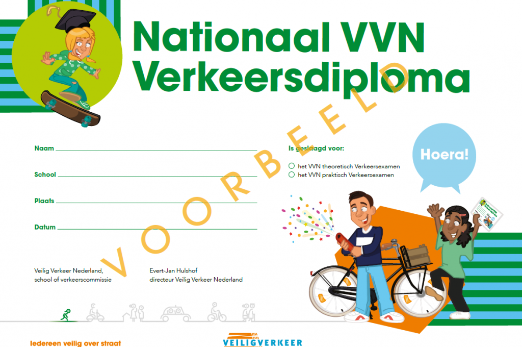 Het examen gaat door op verschillende data in het voorjaar (zie website VVN), en bereidt de kinderen alvast voor op het praktische examen van de VVN. De kinderen maken het examen in een examenboekje. Dit wordt handmatig nagekeken. Zijn ze geslaagd? Dan krijgen de kinderen een heus verkeersdiploma uitgereikt!